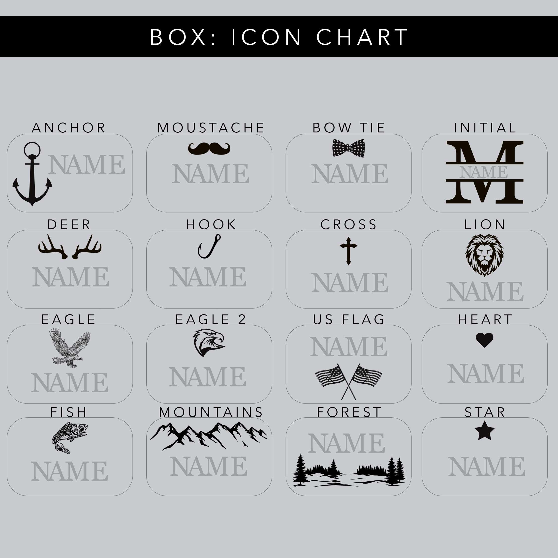 BOX: you can personalize the box with an icon and a name or a short message - see pictures
